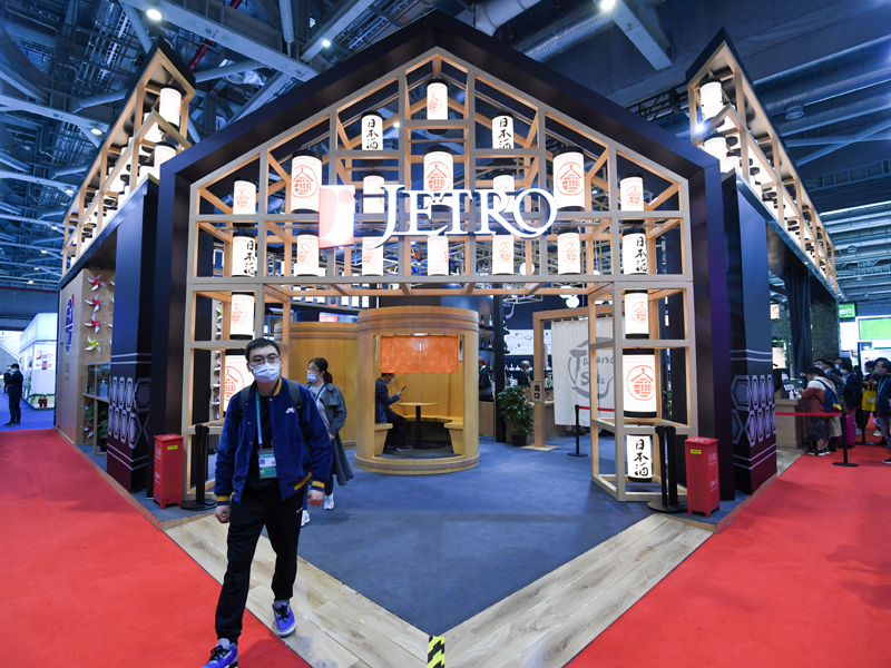 11月10日,觀眾從第三屆進博會食品及農產品展區日本貿易振興機構展臺走出。新華社記者 陳曄華 攝